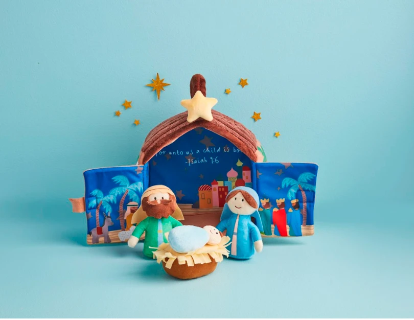 This is a 4-piece Musical Nativity Plush Set for children 18 months and older who are ready to explore the story of Christmas through gentle, hands-on play. Featuring soft, durable Mary, Joseph, baby Jesus figures, and a Nativity stable, with an interactive sound chip in the star that plays “Away in a Manger,” it combines tactile learning with musical engagement. It solves the challenge of introducing the Nativity story to toddlers in a way that’s accessible, safe, and developmentally appropriate-giving families a beautiful set that makes the first Christmas come alive for little ones.
