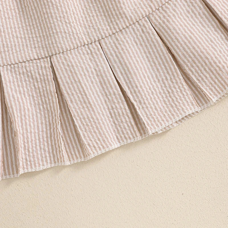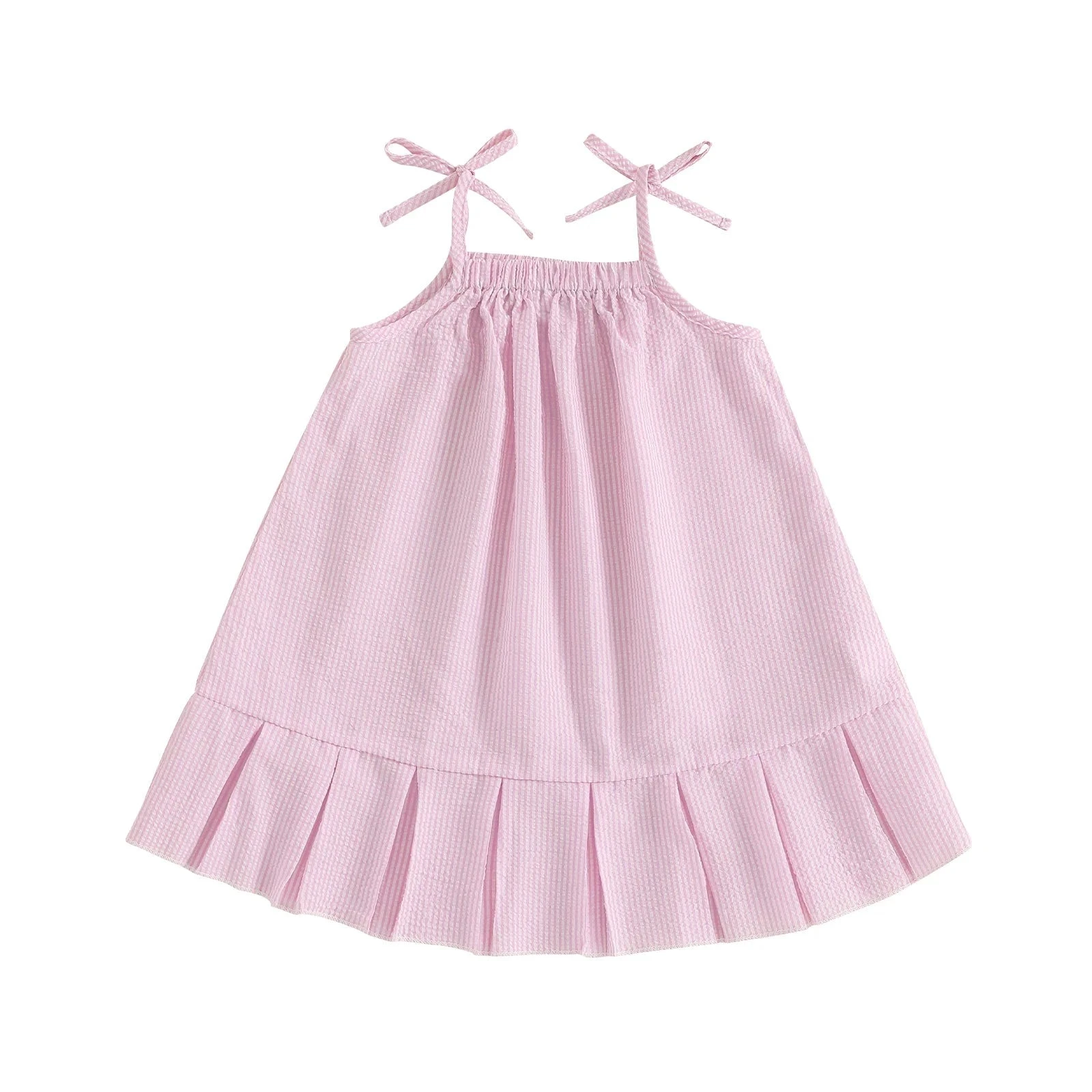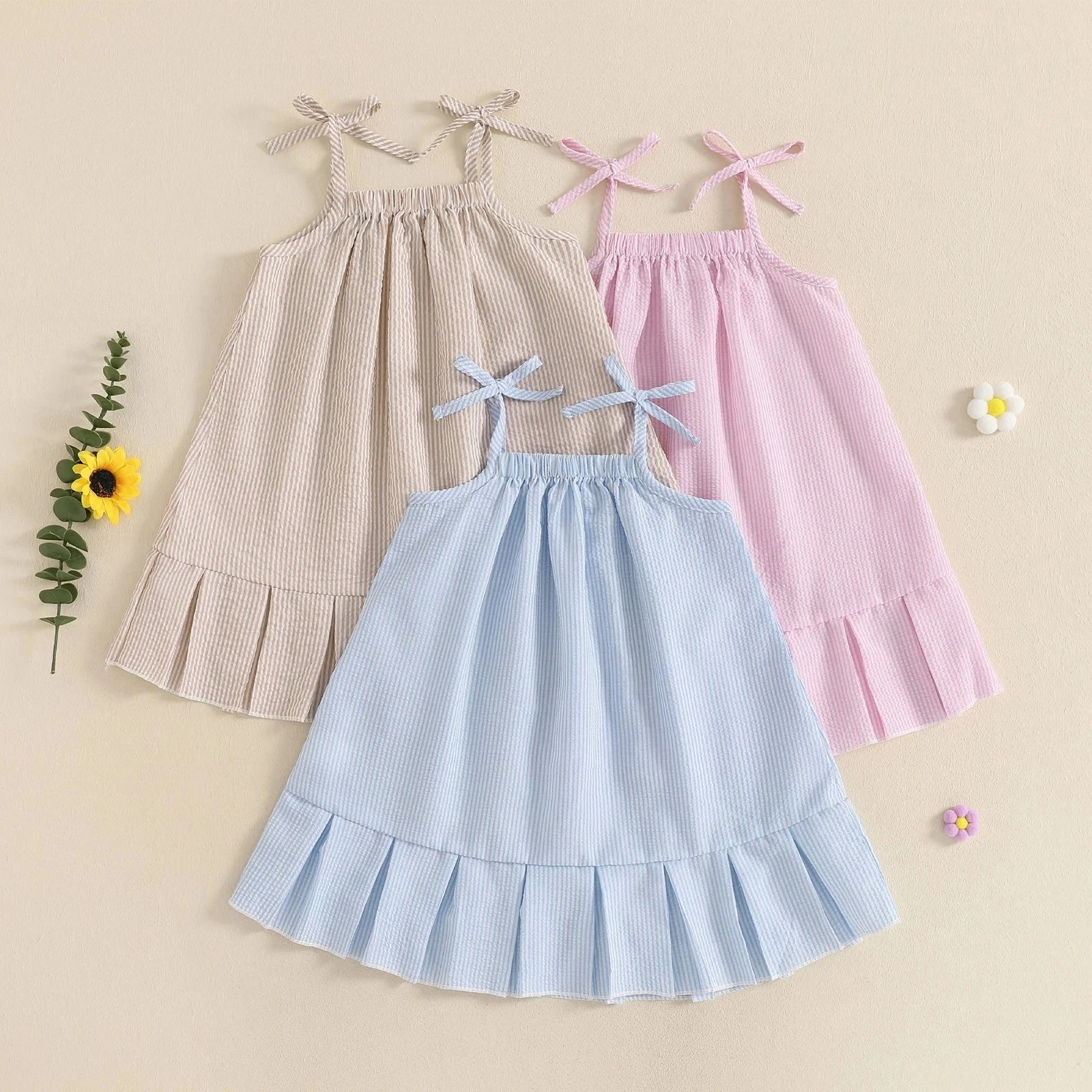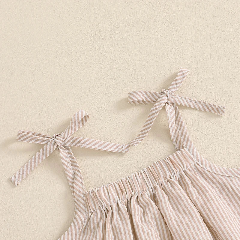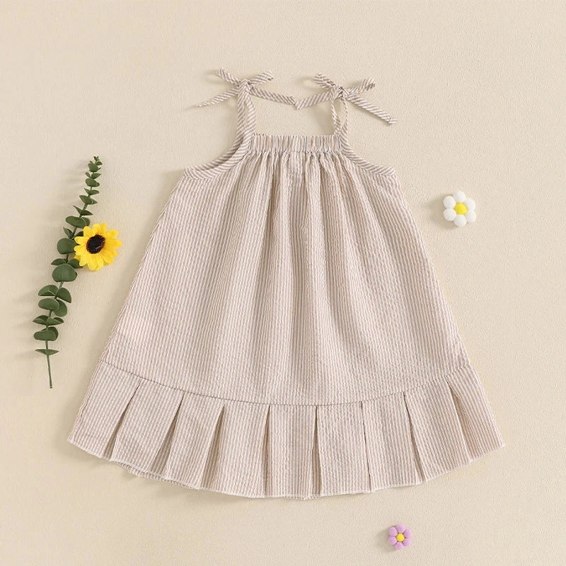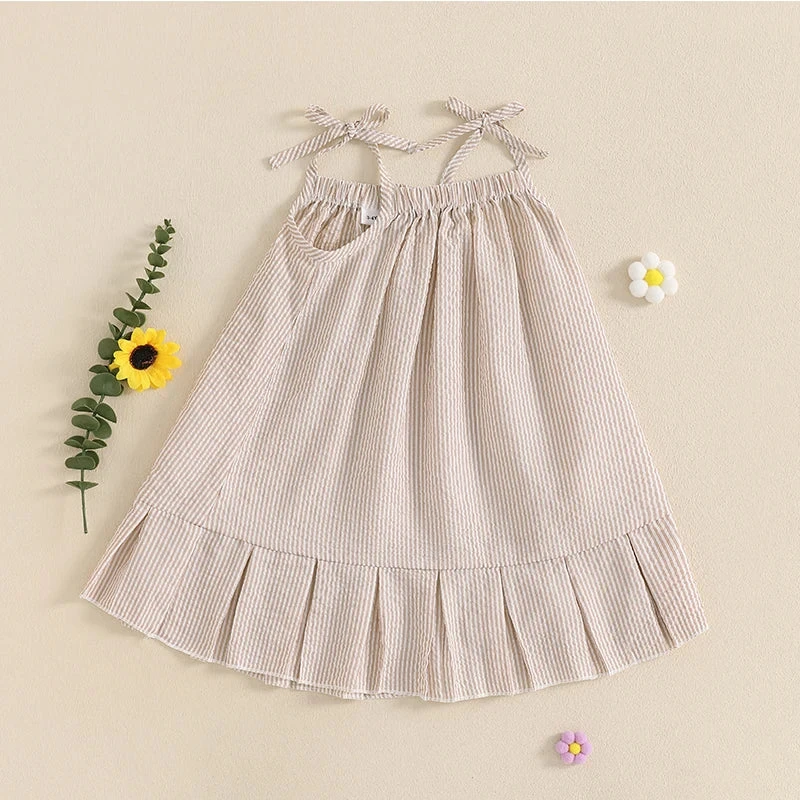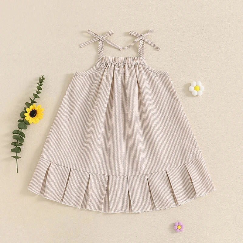 This is a sleeveless shoulder tie striped summer dress for baby and toddler girls who love classic, breezy style. Made from soft polyester, it features timeless stripes with charming shoulder ties that add a touch of sweetness and allow for an adjustable fit. Perfect for warm-weather days, it solves the challenge of finding a dress that’s both simple enough for everyday wear and stylish enough to stand out.