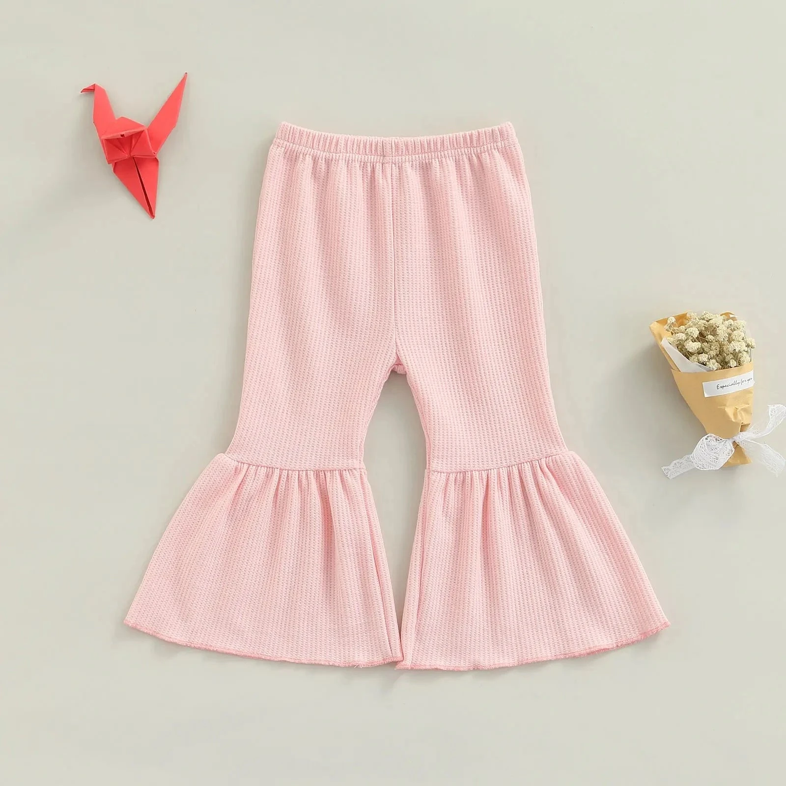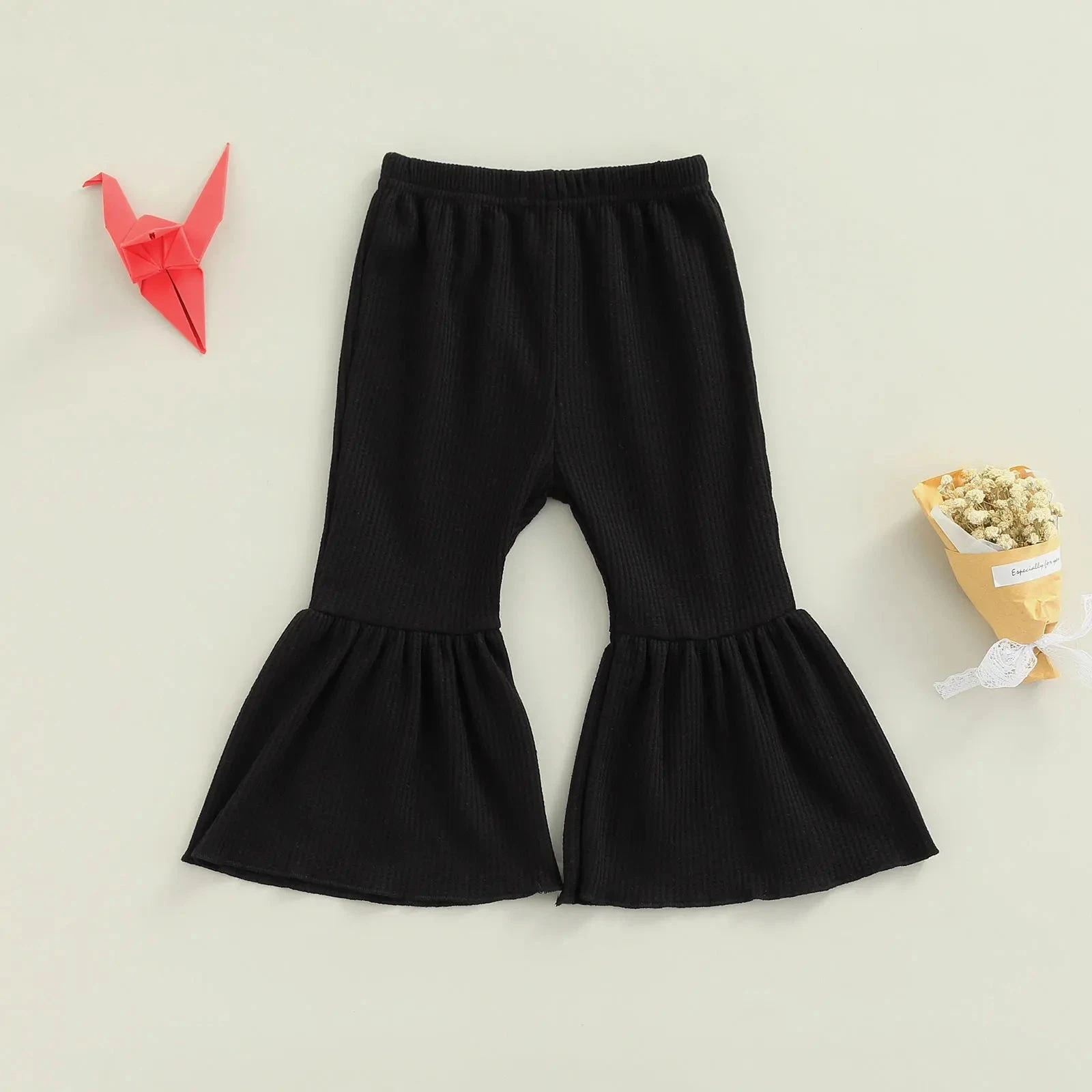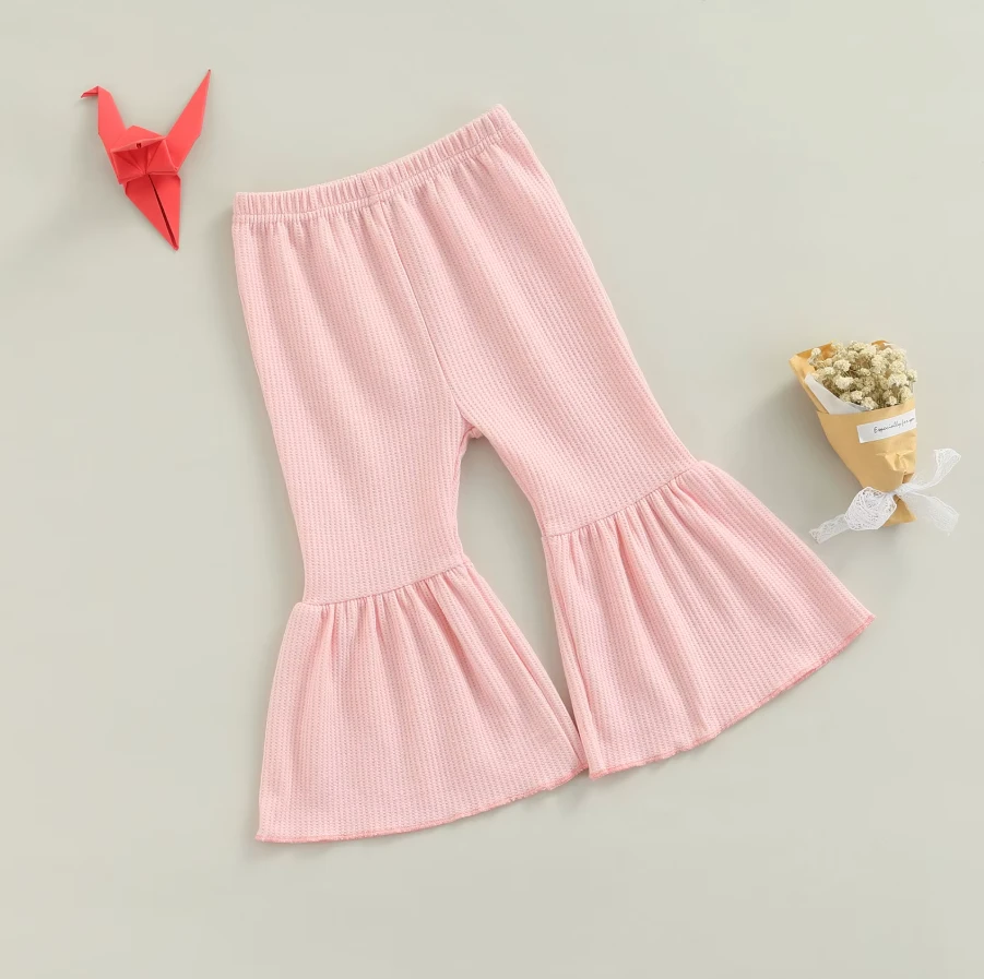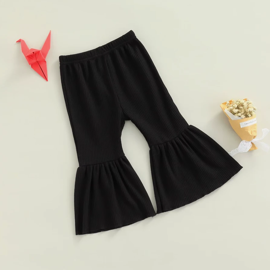 These are solid color cute flare leg elastic waist pants for baby and toddler girls who love comfortable style with a touch of flair. Made from a soft cotton blend, they feature classic solid colors with a trendy flare leg silhouette that adds movement and charm. The elastic waistband ensures easy dressing and all-day comfort. They solve the challenge of finding bottoms that are both practical enough for everyday play and stylish enough to stand out.