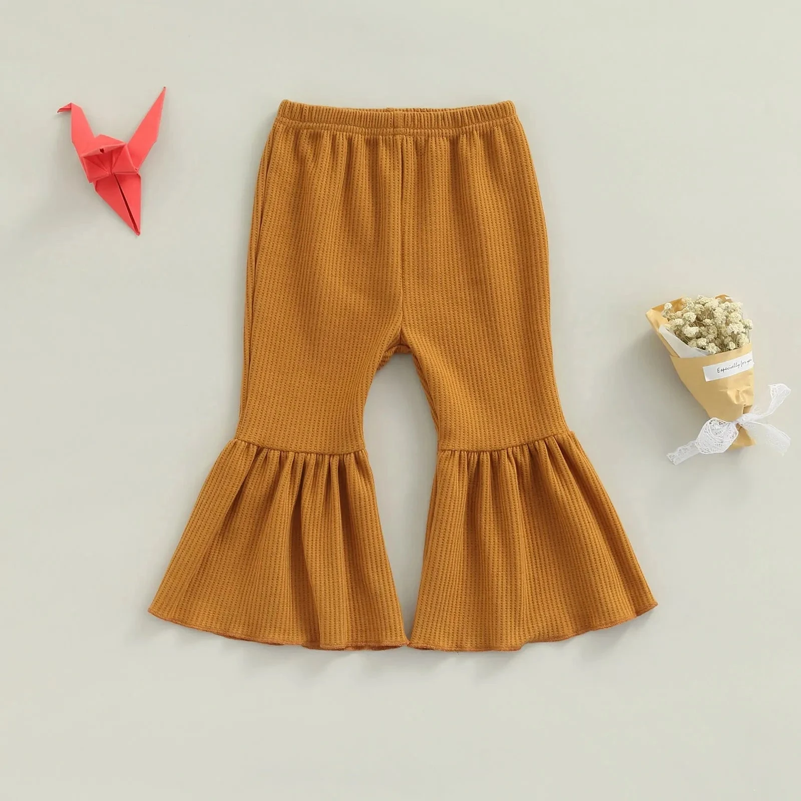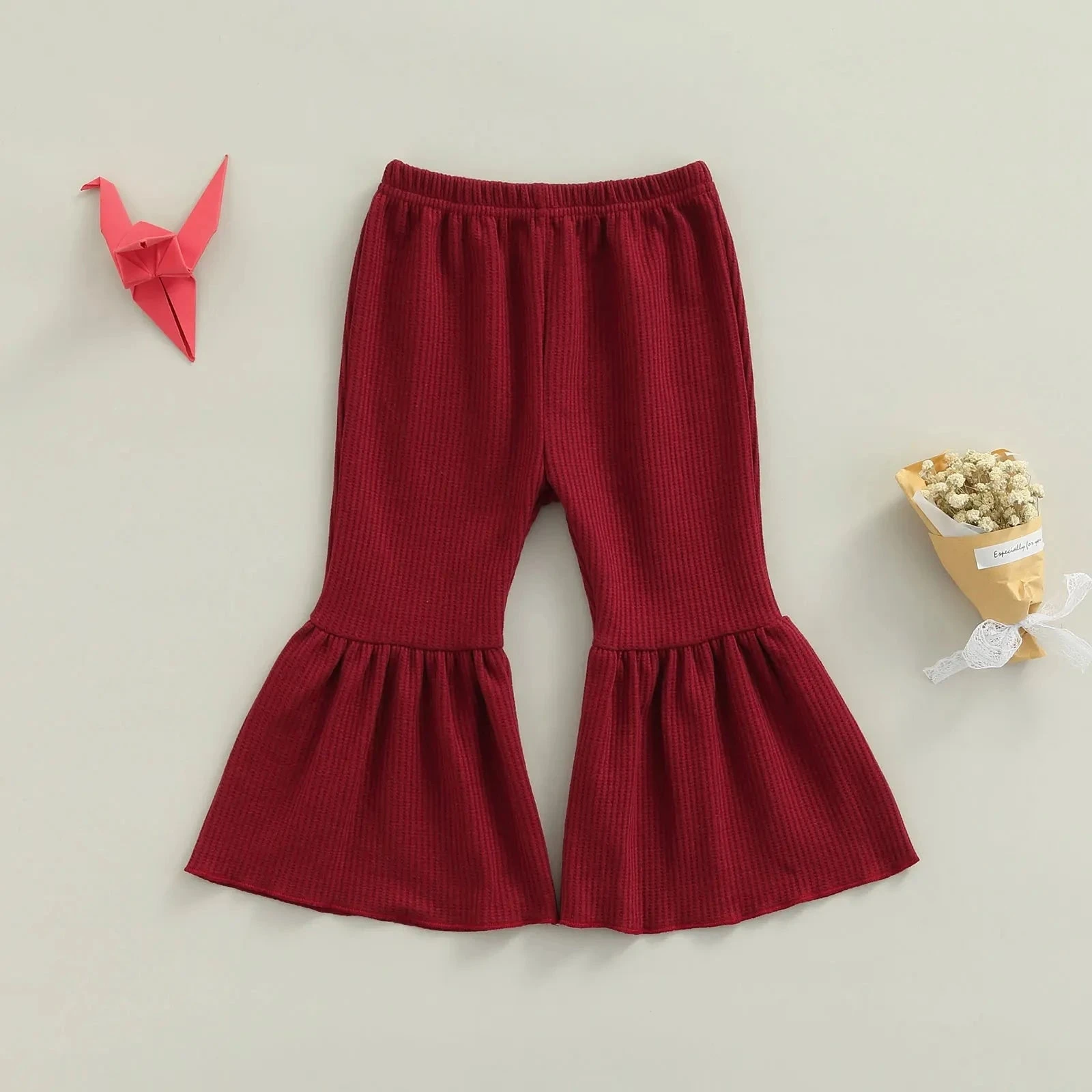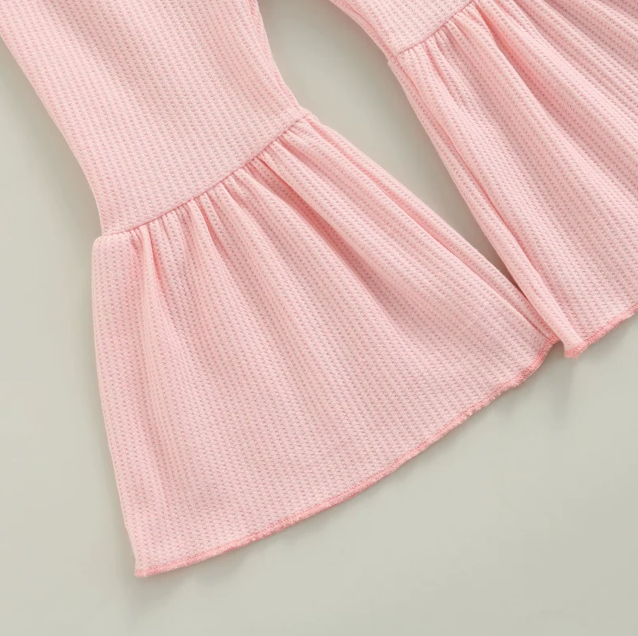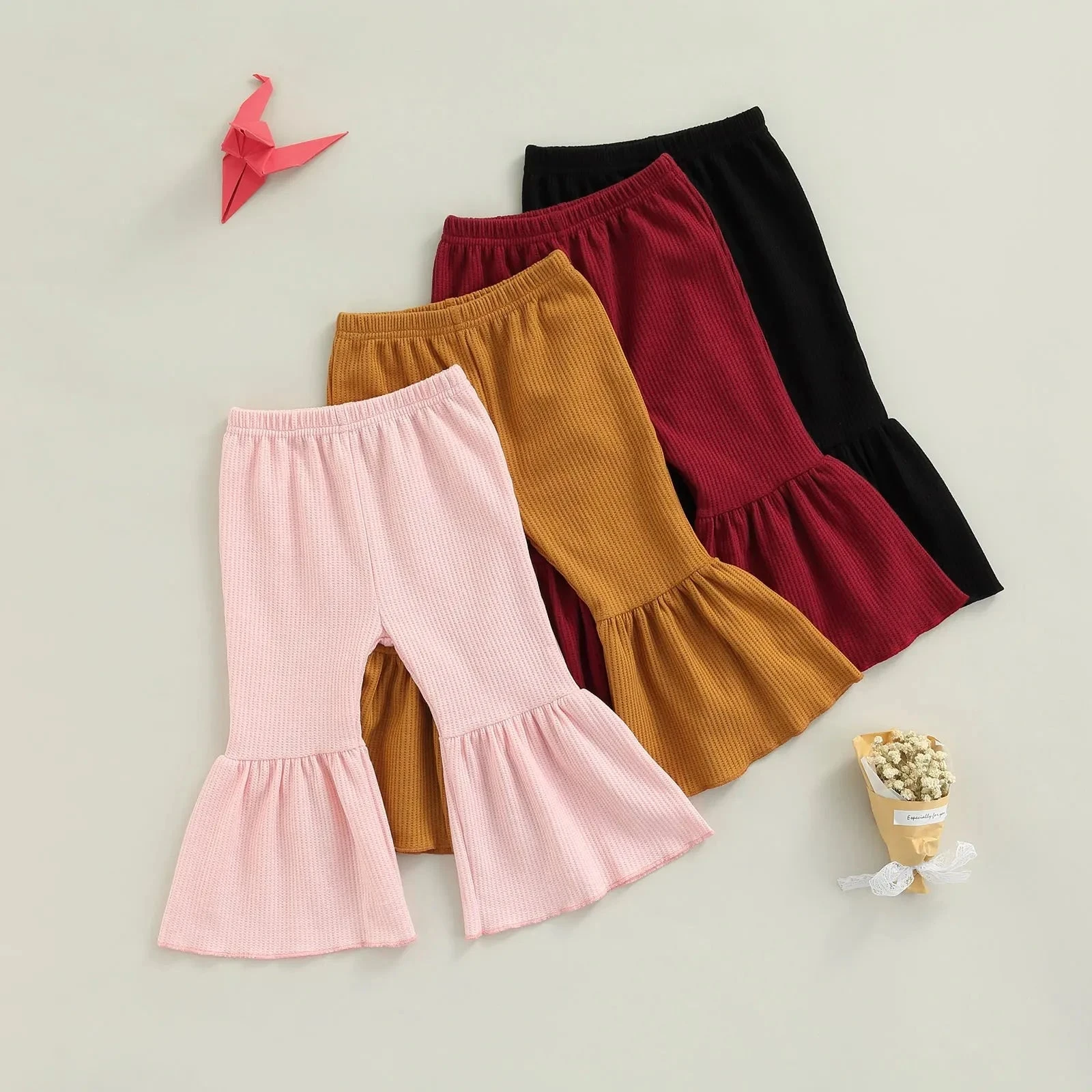 These are solid color cute flare leg elastic waist pants for baby and toddler girls who love comfortable style with a touch of flair. Made from a soft cotton blend, they feature classic solid colors with a trendy flare leg silhouette that adds movement and charm. The elastic waistband ensures easy dressing and all-day comfort. They solve the challenge of finding bottoms that are both practical enough for everyday play and stylish enough to stand out.